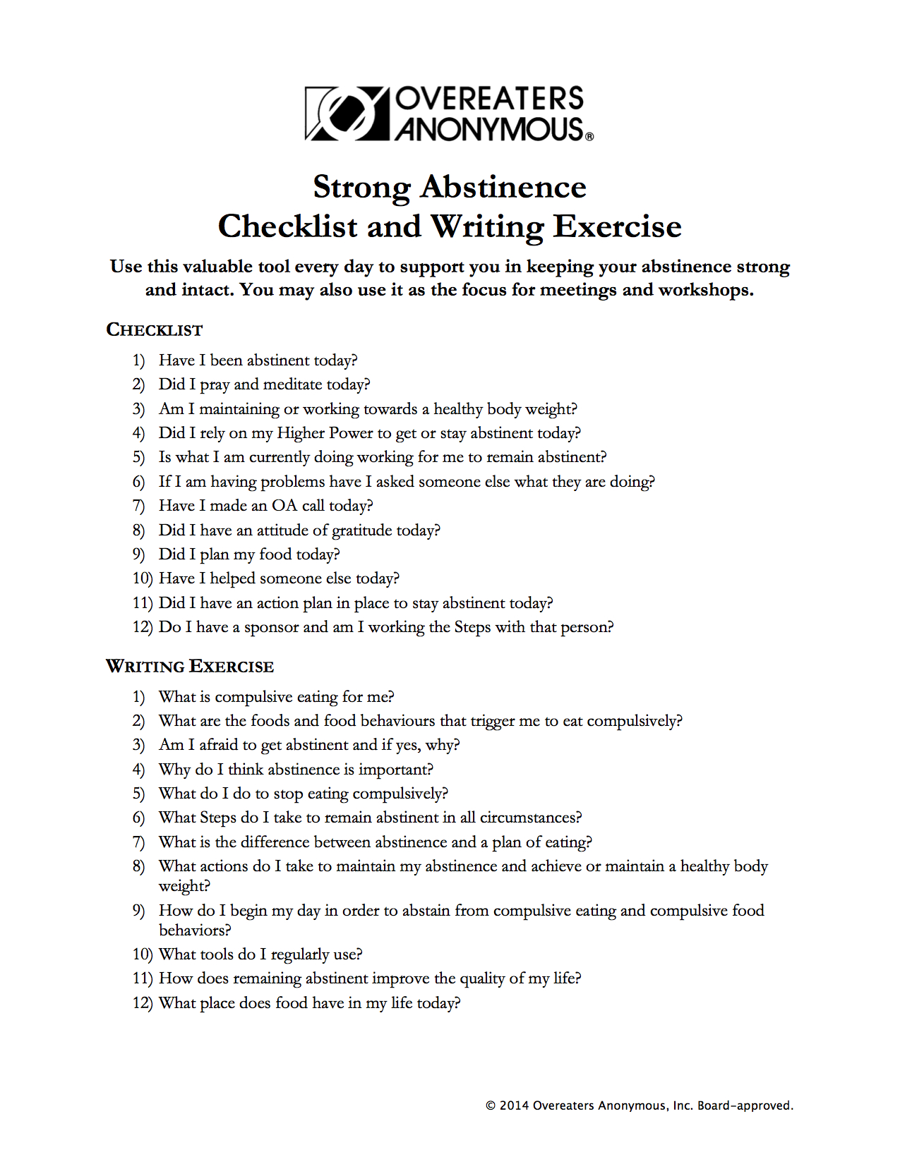 Abstaining from our binge/trigger foods is one of the big points of OA. But abstinence is more than what we eat, it’s our mindset about our eating. It’s acting one day at a time on the belief that we won’t eat no matter what, and no matter what we won’t eat. It’s also using OA’s 9 tools and letting the fellowship support our abstinence instead of going it alone.